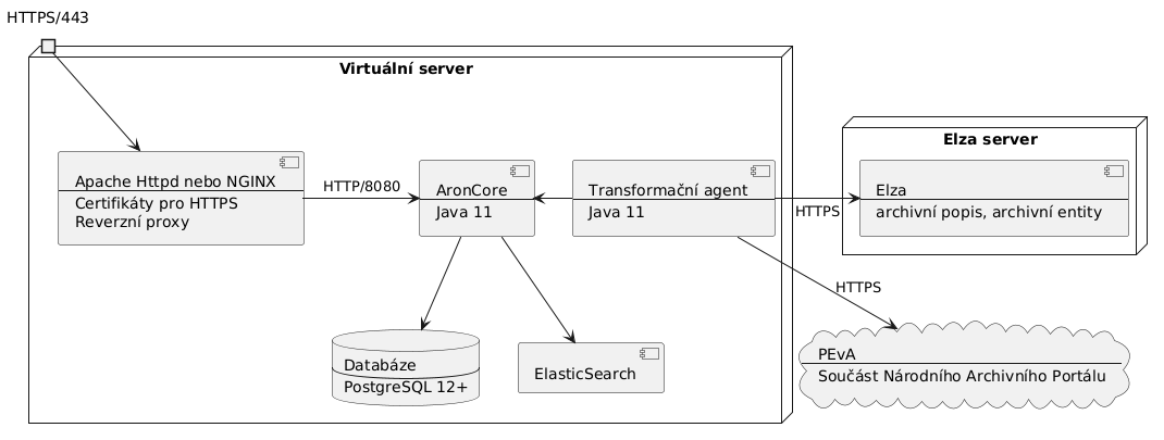 Poměrně obvyklou variantou k uvedenému příkladu je řešení, kdy webový server (Apache HTTPD, NGINX, IIS) je instalován na jiném serveru a na virtuálním serveru je nainstalována jen aplikace Aron. V takovém případě je server čistě aplikační a uživatelé k němu přistupují prostřednictvím samostatného webového serveru na nějž je směrováno URL, např. https://aron.organizace.cz.