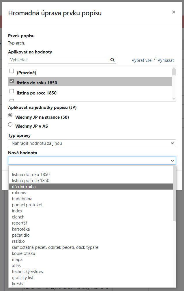 V režimu úprav je možné nad sloupci tabulky provádět hromadné operace. Níže uvedené akce lze aplikovat na vybrané záznamy (jednotky popisu) nebo hodnoty.