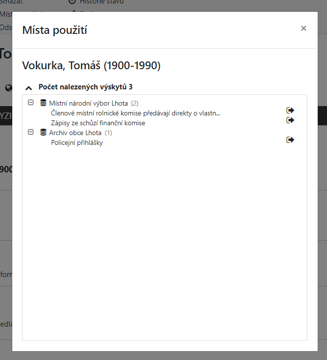 Funkcionalita umožňuje jednoduchý přehled o archivních souborech a jednotkách popisu, k nimž je vybraná archivní entita napojena jako přístupový bod. Po kliknutí na odkaz se zobrazí konkrétní jednotka popisu v modulu Archivní soubory.